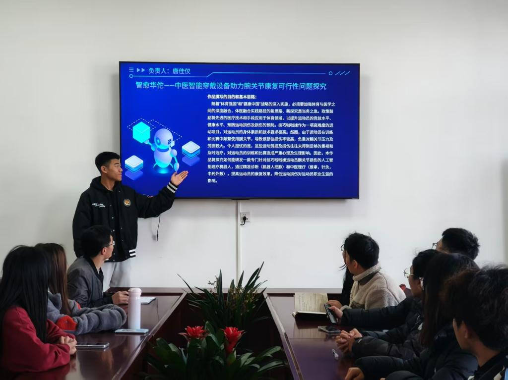 老师们立足体育学科特色,紧扣“体育+科技”“体育+社会服务”等前沿方向,引导学生将专业知识与现实需求深度结合——或聚焦运动损伤预防、智能训练设备研发等科技应用领域,或关注乡村体育振兴、残疾人体育参与等社会治理议题,助力团队打破学科壁垒,组建跨专业协作小组。在备赛关键阶段,指导老师们逐字打磨申报文本,从逻辑架构到数据支撑严格把关;反复开展模拟答辩,针对语言表达、仪容仪态等细节精准指导,甚至熬夜陪同学生优化实验方案、完善调研数据。