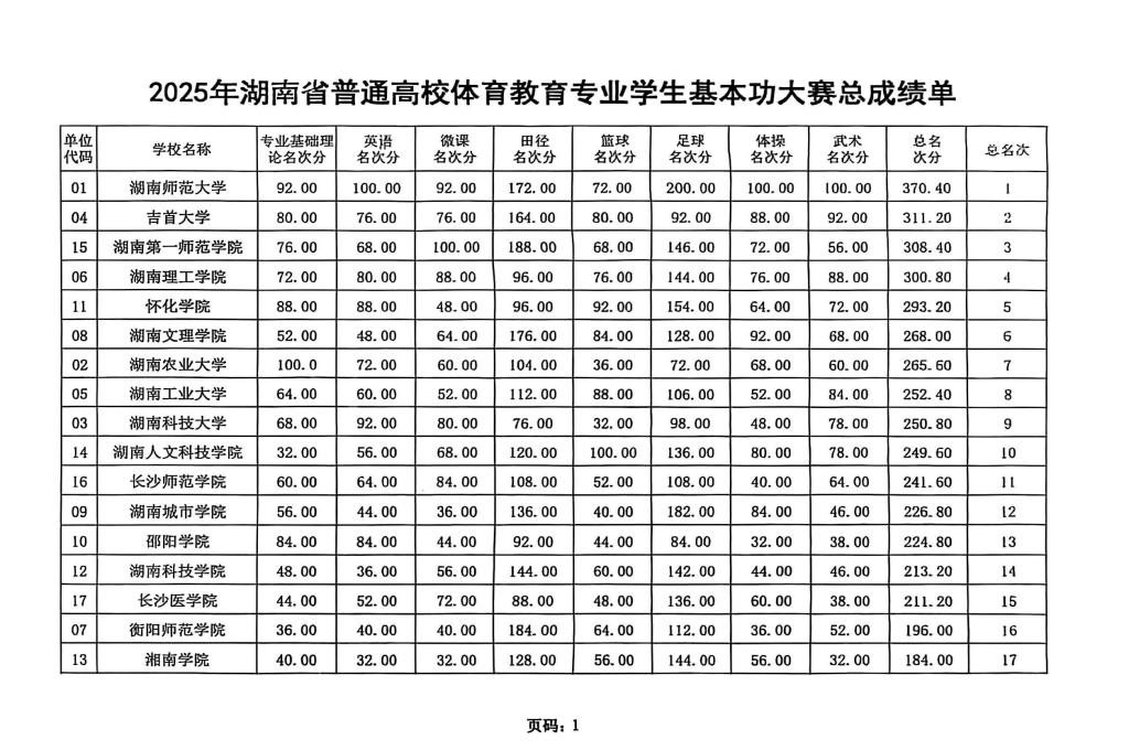 6月16日-19日,由湖南省教育厅主办的“湖南省第八届普通高等学校体育教育专业学生基本功大赛”在湖南师范大学举行,全省包括湖南师大、湖南科大、吉首大学等17所高校参加。我校代表队经过三个多月的艰苦强化训练和四天的激烈角逐,获得了体操团体第二名、田径团体第三名、篮球团体第四名、武术团体第八名;获得运动技能团体一等奖、团体总分二等奖,获奖级别和获奖率居全省高校前列。
