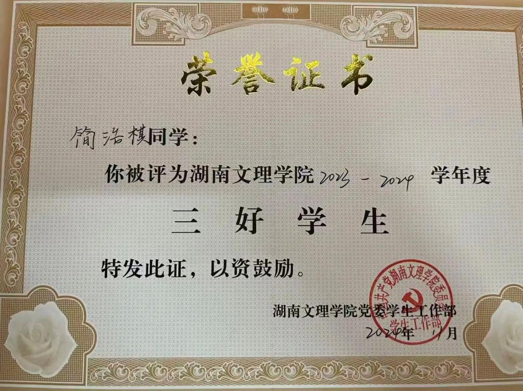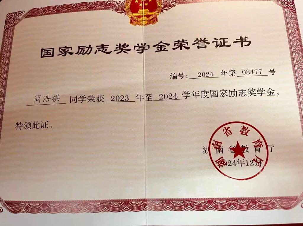 赛场之外,简浩棋在学业上同样毫不松懈。他凭借优异的成绩斩获2023-2024学年国家励志奖学金、2023-2024学年湖南文理学院甲等奖学金,还获评学校“三好学生”。这份亮眼的学业答卷,印证了他“文体兼修”的成长追求,也展现了当代大学生平衡专业学习与兴趣发展的优秀能力。