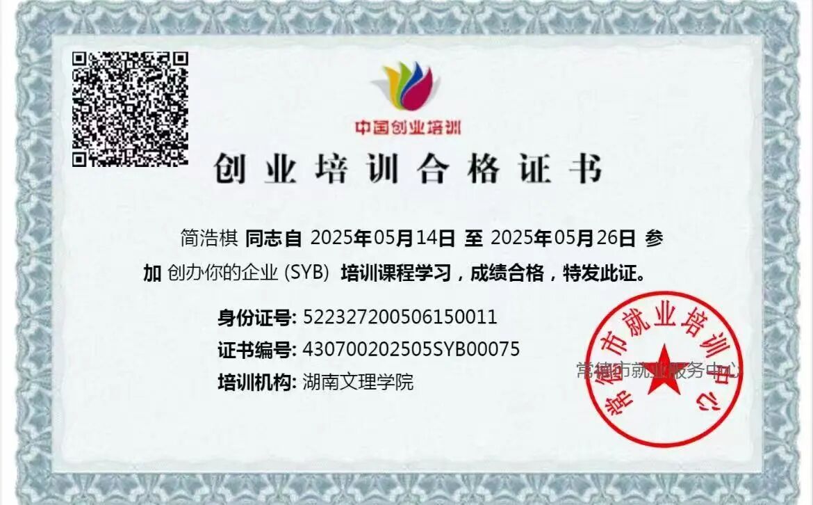 简浩棋的成长脚步从未停歇:2025年5月,他完成SYB创业培训课程并取得合格证书,迈出创业学习的第一步;同年6月,他在学校第十一届师范生教学技能竞赛中获三等奖,在跨文化能力大赛短视频赛中带领团队拿下二等奖;同时,他还被聘为湖南文理学院“学生资助宣传大使”,以自身力量传递温暖与正能量
