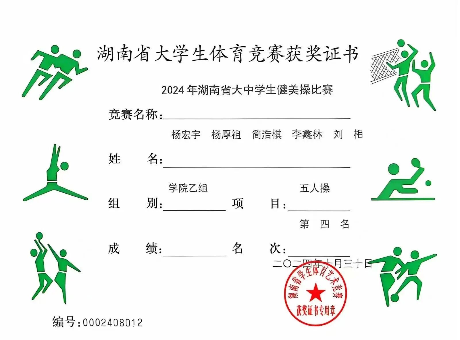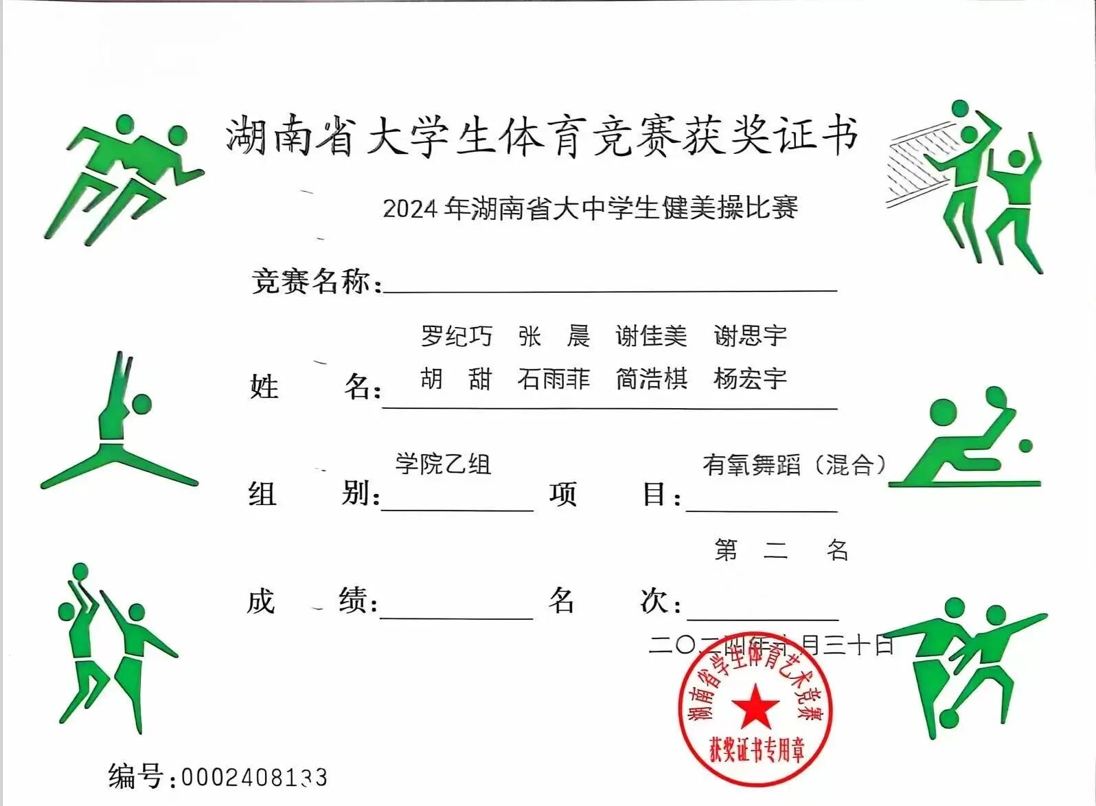 作为健美操赛场的活力选手,简浩棋在2024年湖南省大中学生健美操比赛中大放异彩:与队友携手拿下学院乙组男子有氧踏板操第一名、有氧舞蹈(混合)第二名、五人操第四名。每一个精准的动作、每一次默契的配合,都是他与团队日夜训练的成果,省级赛场的奖牌,是对他体育拼搏精神的最好嘉奖。