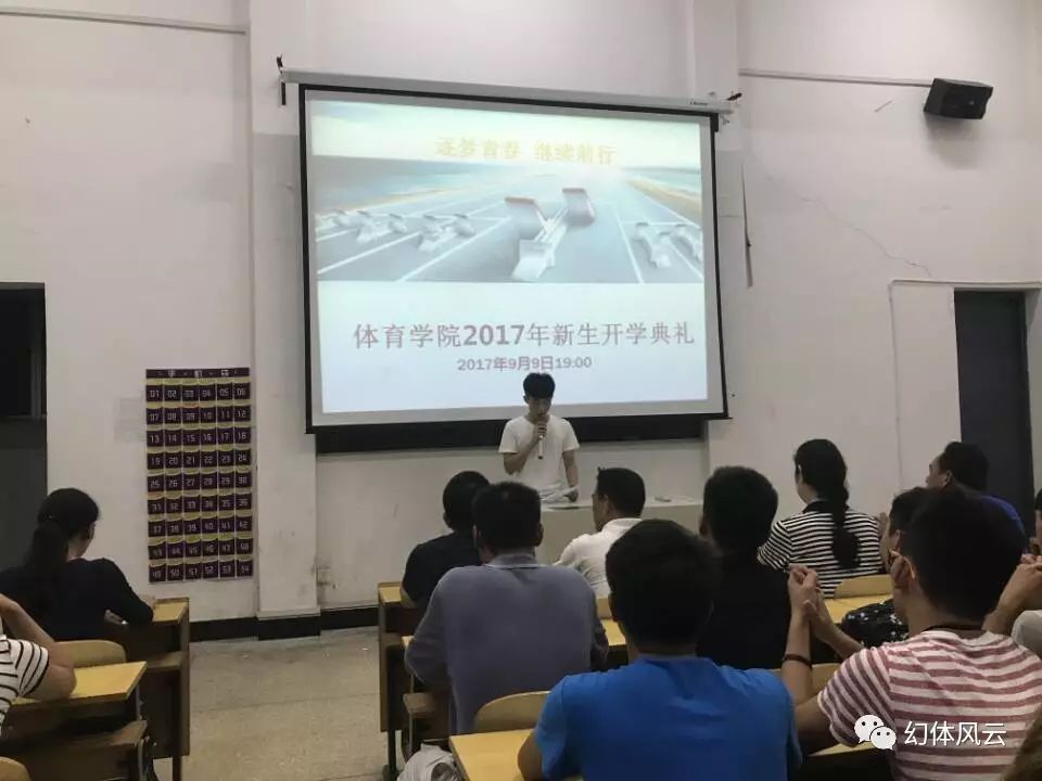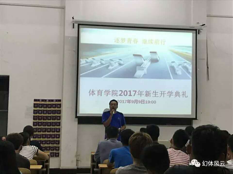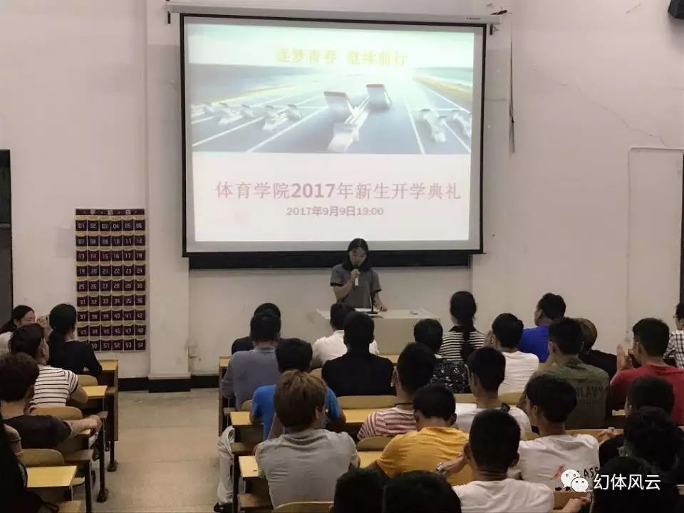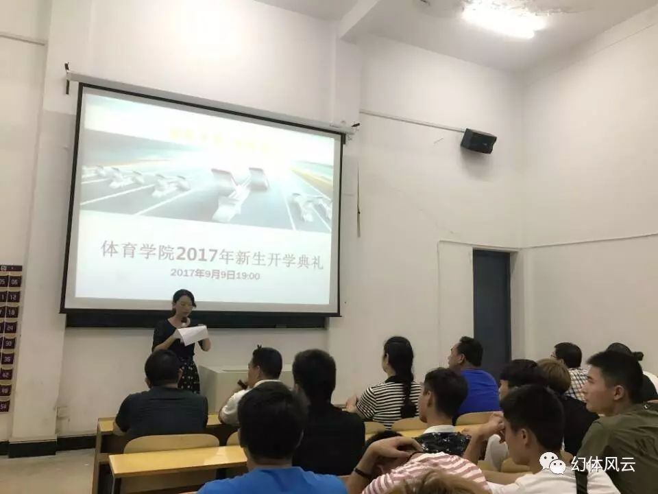 2017年9月9日晚7:00,体育学院在A119教室举行新生开学典礼,体育学院院长刘锋、党总支书记龚晓红、党总支副书记樊浩、副院长吴步阳、副院长毛治和、学工办老师欧志渊、李瑾璇以及部分优秀教师代表、新生班主任出席会议。