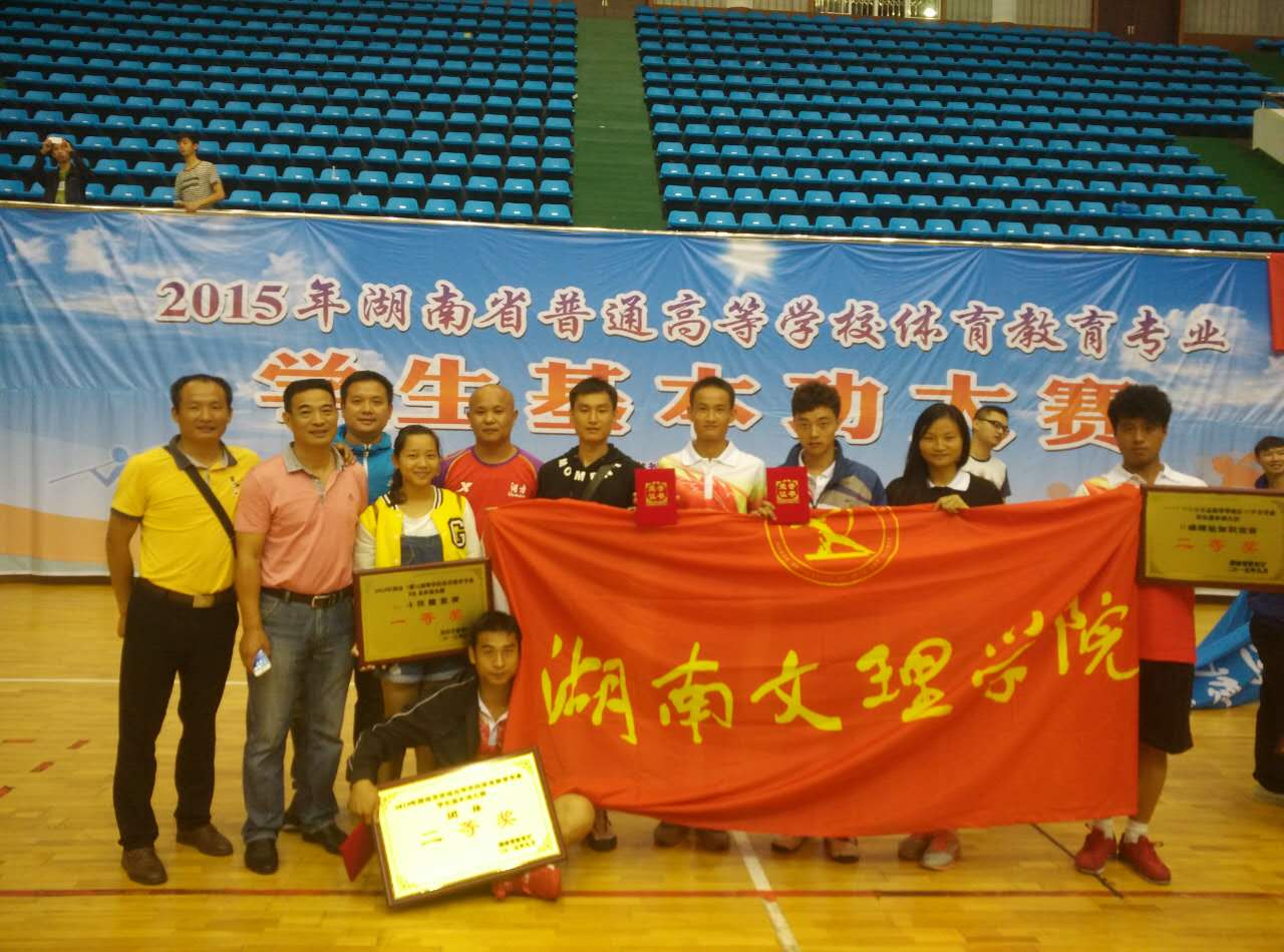 热烈祝贺我院获得2015年湖南省普通高等学校体育教育专业学生基本功大赛:足球第一名,田径第三名,英语第四名,运动技能一等奖,基础理论知识二等奖,团体二等奖的佳绩。