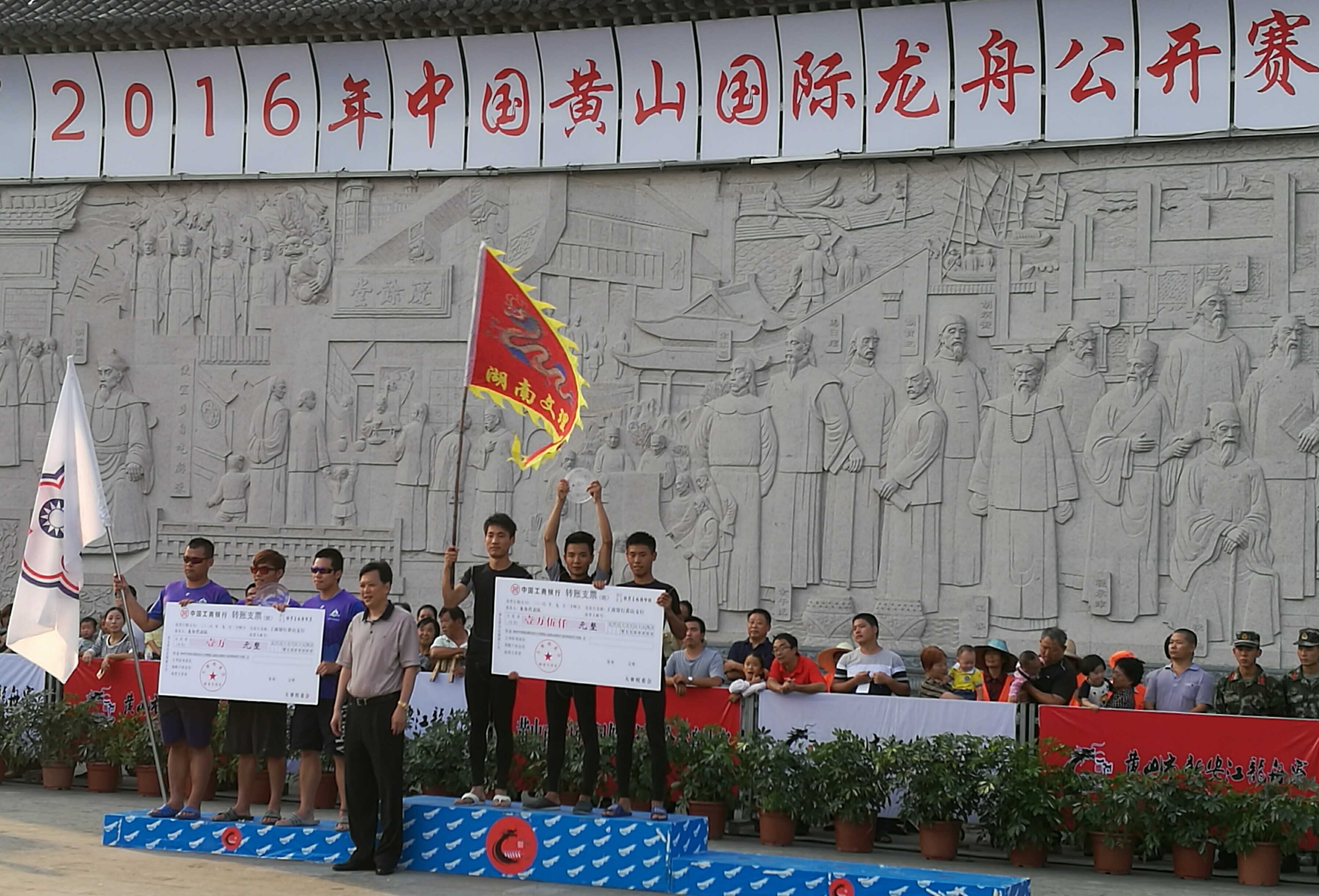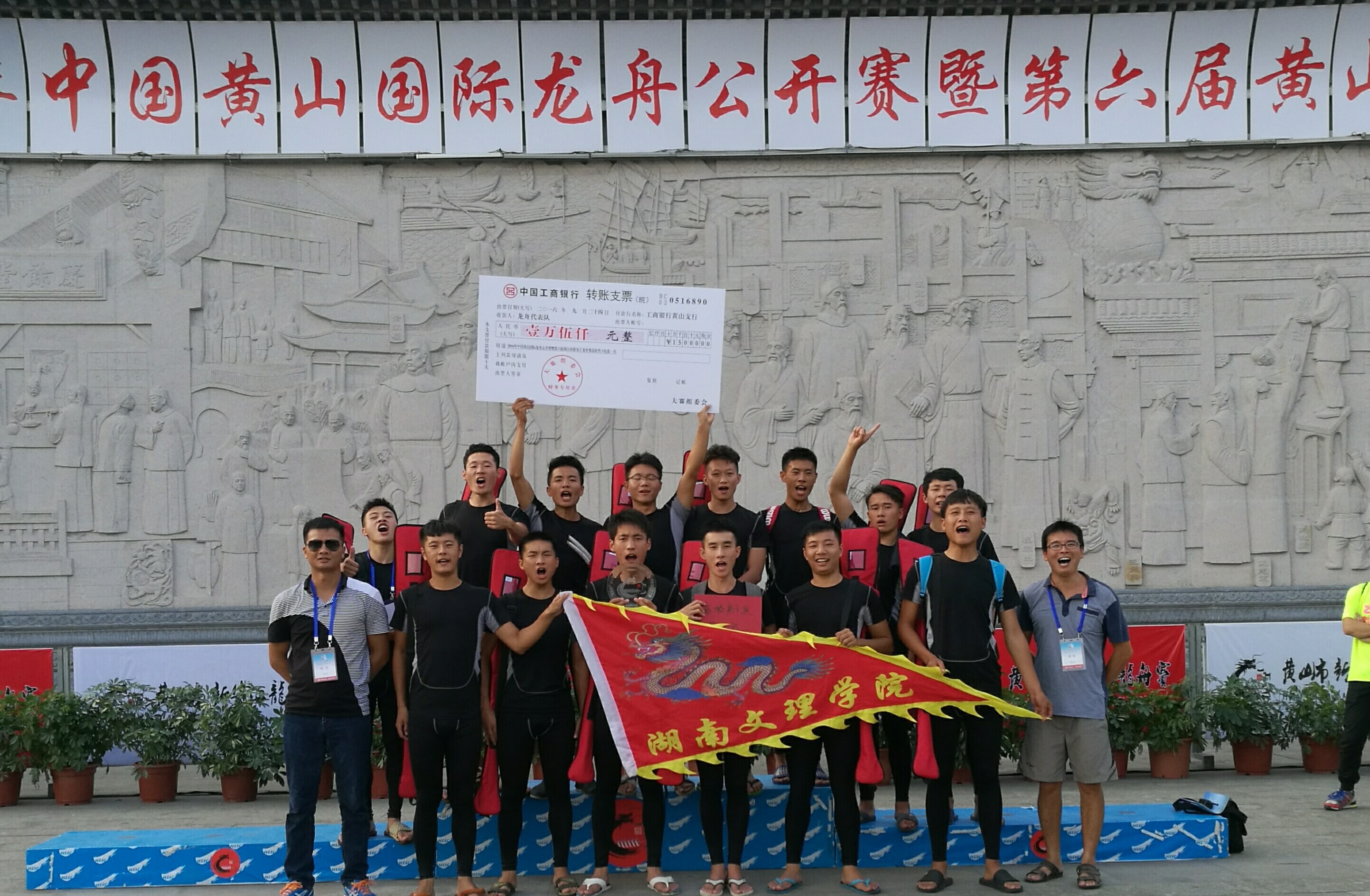 2016年9月24日在安徽省黄山市新安江照壁怀古河段“2016年中国黄山国际龙舟公开赛”隆重举行,来自香港、澳门、中华台北及其他省市和高等院校共23支代表队400名高水平运动员参赛,本次比赛共设有200米直线竞速和500米直线竞速两个项目。经过预决赛激烈的角逐,我校龙舟队最终以200米直线竞速第一名和500米直线竞速第一名的优异成绩,荣获高校男子组第一名。此次比赛不但弘扬了“同舟共济、顽强拼搏、奋勇争先”的龙舟精神,更充分体现了我校龙舟健儿精诚团结、顽强拼搏的作风,展示了我校学子的风采,为湖南文理学院争得了荣誉。