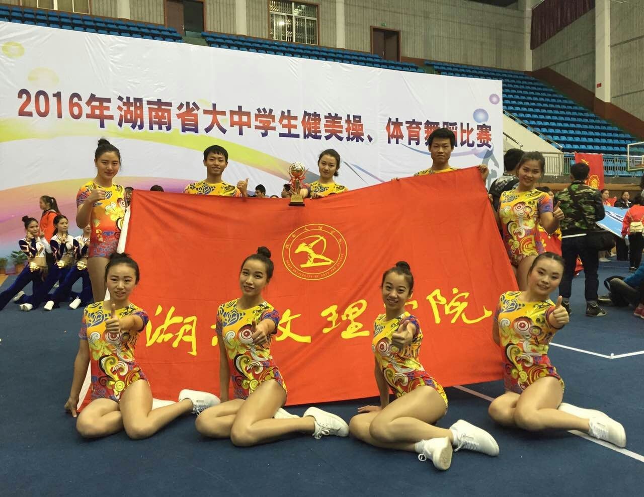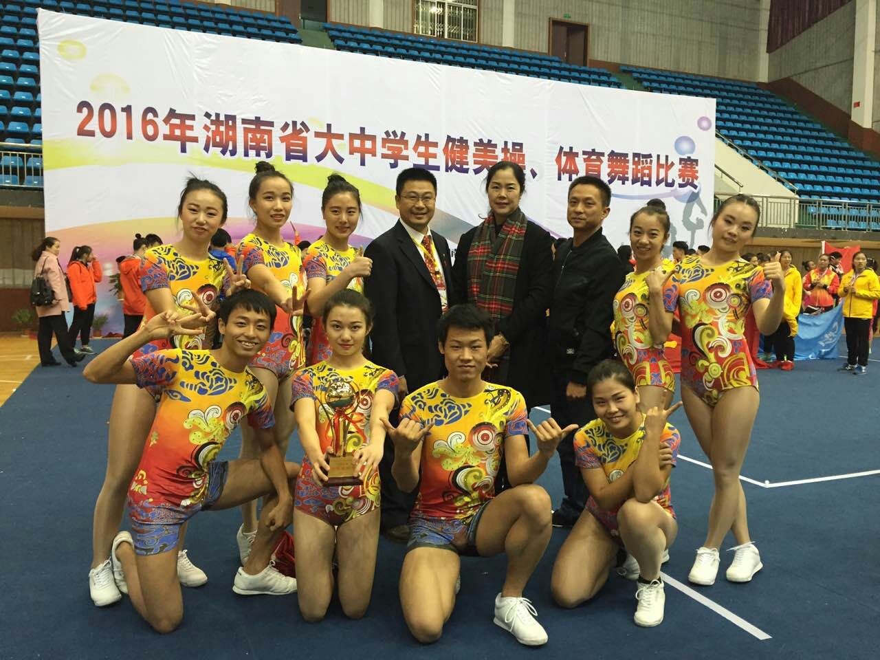 2016年湖南省大中学生健美操锦标赛于10月29日至30日在湖南师范大学落下帷幕,我校代表队由领队体育学院龚晓红书记、主教练李松老师的带领下,共派出九名运动员参加本次比赛。经过了两天的激烈角逐,我校代表队取得了男子单人、女子单人、女子三人、混合五人四个项目的学院乙组第二名的成绩。并取得团体第四名。本次比赛由省教育厅主办,全省共28所大中学校代表队参加,汇集了众多的健美操顶尖高手。