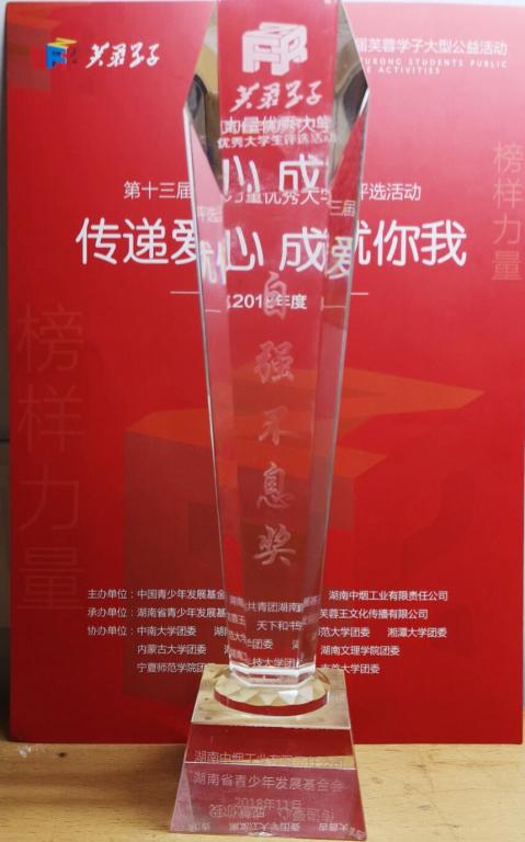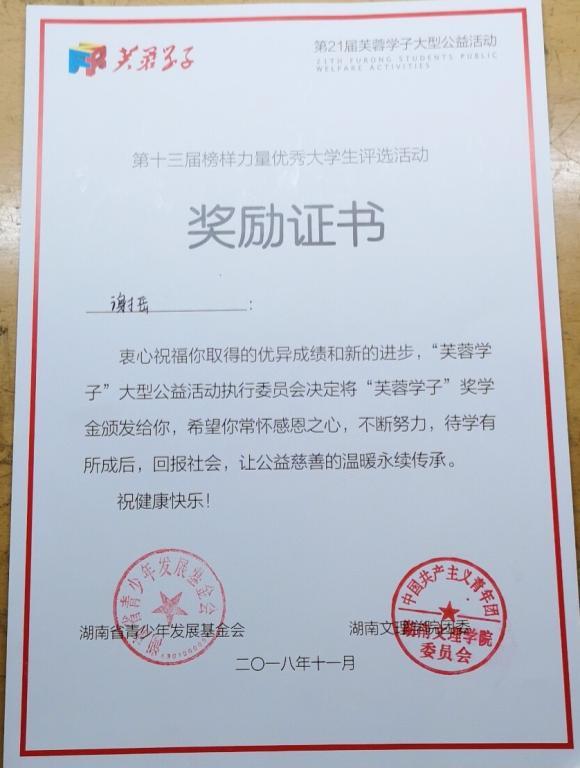 谢岳同学获湖南文理学院“第十三届芙蓉学子·榜样力量优秀大学生之自强不息奖