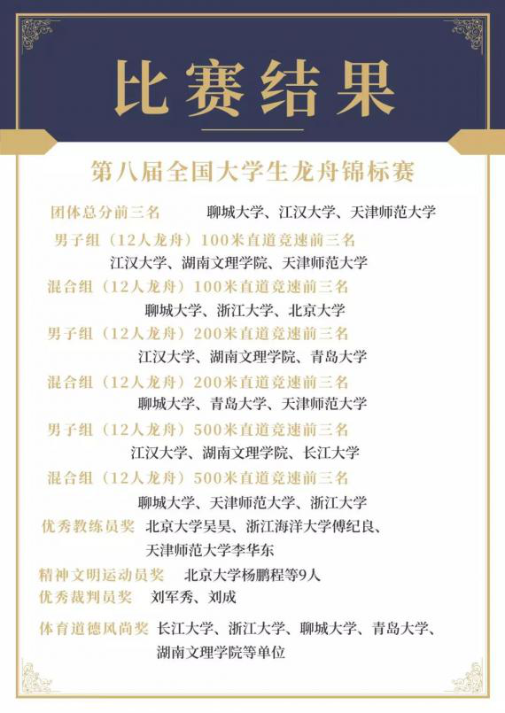 在学校体委正确领导和体育学院师生的大力支持下,我校龙舟队员们克服了一切困难,本次比赛后已跻身全国一流高校龙舟队行列。通过本次比赛,我校龙舟队展示了湖南文理学院大学生勇于拼搏、争创一流的精神风貌,进一步提高了我校的办学声誉和社会地位。