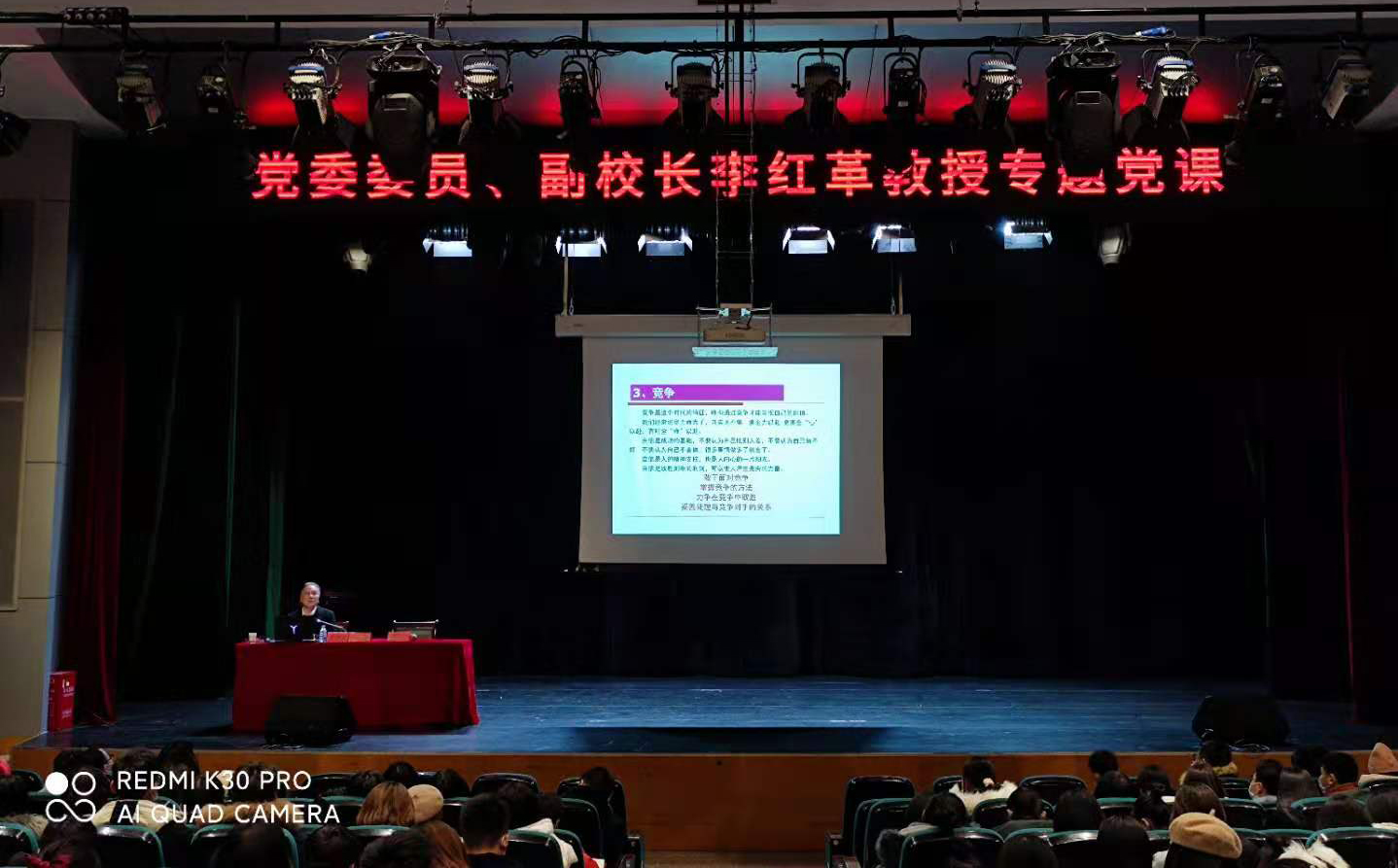 12月3日晚上7点,党委委员、副校长李红革以“不负青春、不负韶华,做时代新人”为题,在音乐厅为艺术学院、马克思主义学院、文史与法学学院、体育学院等四个学院的400余名党员师生、入党积极分子讲授专题党课。党课由文史与法学学院党总支书记夏子科主持。