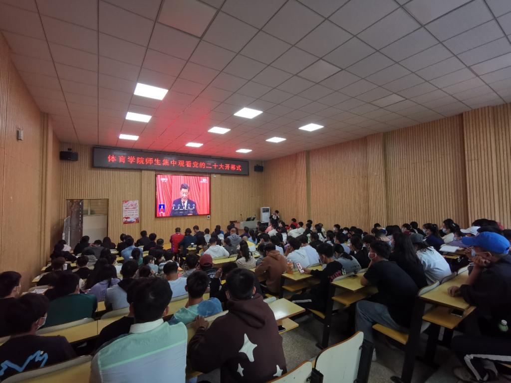 10月16日上午,体育学院组织全体教职员工和130余名学生在A123多媒体教室集体观看党的二十大开幕盛况,认真聆听习近平同志代表第十九届中央委员会向党的二十大作的工作报告。学院其他学生在宿舍集中收看。开幕会结束后,体育学院党总支理论学习中心组第一时间开展学习讨论。
