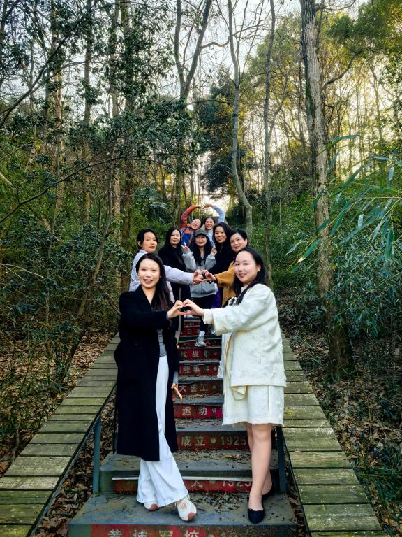 林间栈道上,女教职工们并肩比心,在春日绿意中定格温暖瞬间。