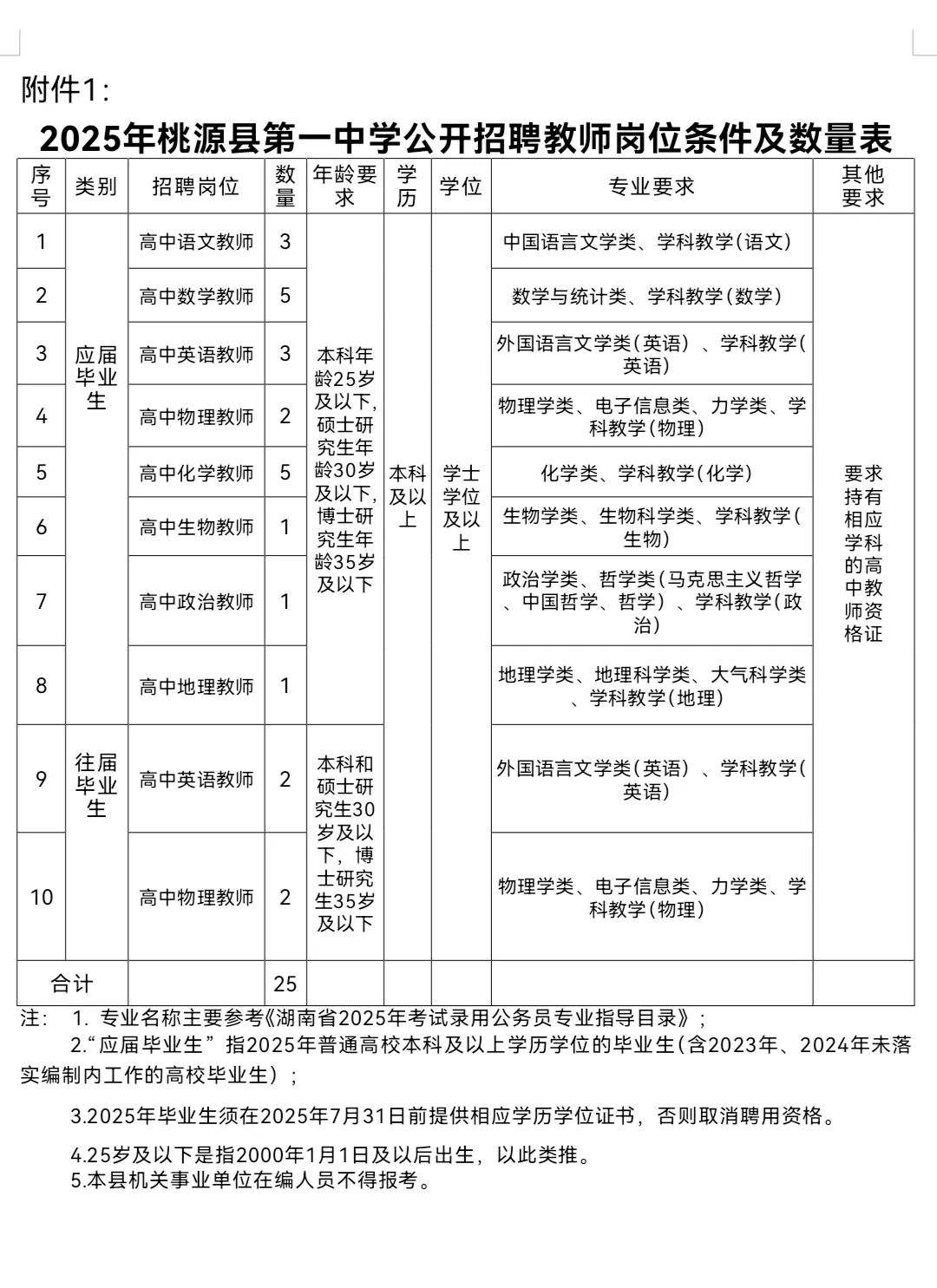 招聘高中教师25名。具体岗位及数量条件(见附件1)。