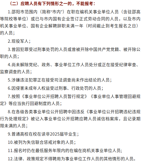 三、引进程序和方法引进工作按报名、现场资格审查、考试、体检、考察、公示、聘用等程序进行。(一)报名和现场资格审查报名方式为现场报名。现场报名时间:2025年4月7日至4月11日(上午8:30-12:00,下午15:00-17:30)。报名地点:隆回县人力资源和社会保障局3栋1楼县人力资源市场服务中心大厅。现场资格审查时,报考人员需按从上往下的顺序整理并提交以下报名资料(其中③、④、⑦三份材料需现场审查原件,原件查验后当场退还本人):①《2025年隆回县县直事业单位人才引进报名登记表》(附件2);②本人近期一寸免冠蓝底彩色正面纸质照片3张(背面写上姓名和报考岗位代码)及该证件照高清电子照片1张(照相馆专业拍摄,手机原图保存,报名时需扫码上传至信息录入系统,不得使用身份证或纸质照片翻拍、扫描上传);③有效身份证正反面(不含电子身份证、过期身份证,下同)复印件1份;④大学本科、硕士研究生及以上毕业证、学位证书复印件各1份(留学归国人员还需提供教育部学历学位认证,2025年国内应届高校毕业生应提供就读学校盖章的《毕业生就业推荐表》);⑤大学本科、硕士研究生及以上《教育部学历证书电子注册备案表》各1份(学信网下载);⑥在编在岗的机关事业单位报考人员需提供所在单位和主管部门同意报考证明原件1份(见附件3,需列明所在单位联系电话并加盖单位行政公章);⑦岗位要求的相关证件(法律职业资格证、教师资格证、执业医师资格证、规培证、副主任医师及以上职称等)复印件1份;⑧岗位要求的其他证明材料(中共党员证明、发表论文、相关工作经历等)。以上资料的取得时间和计算年限截止到考生报名之日。报名资料不全者,不接受报名。2025年应届高校毕业生应在2025年8月31日前取得与报考岗位相应的应届学历学位证书,否则取消聘用资格。