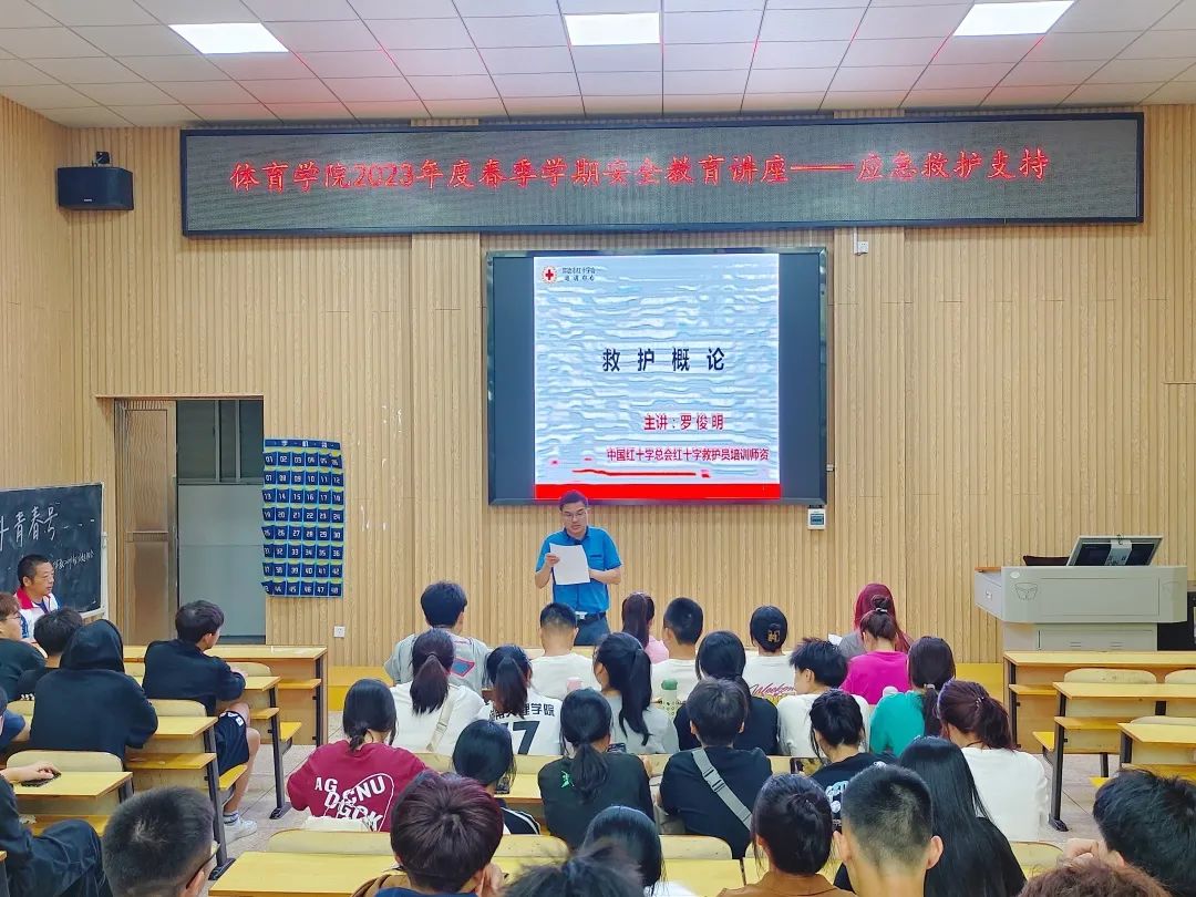 为了普及安全教育,规范救援行为,我院于2023年4月21日中午在体院A123举办了2023年度春季学期安全教育——应急救护支持。参加讲座的有主管我院学生工作的副书记杨锋、常德市鼎城区红十字救援队常务副队长罗俊明、我院辅导员付乐及我院22、21、20级学生代表。